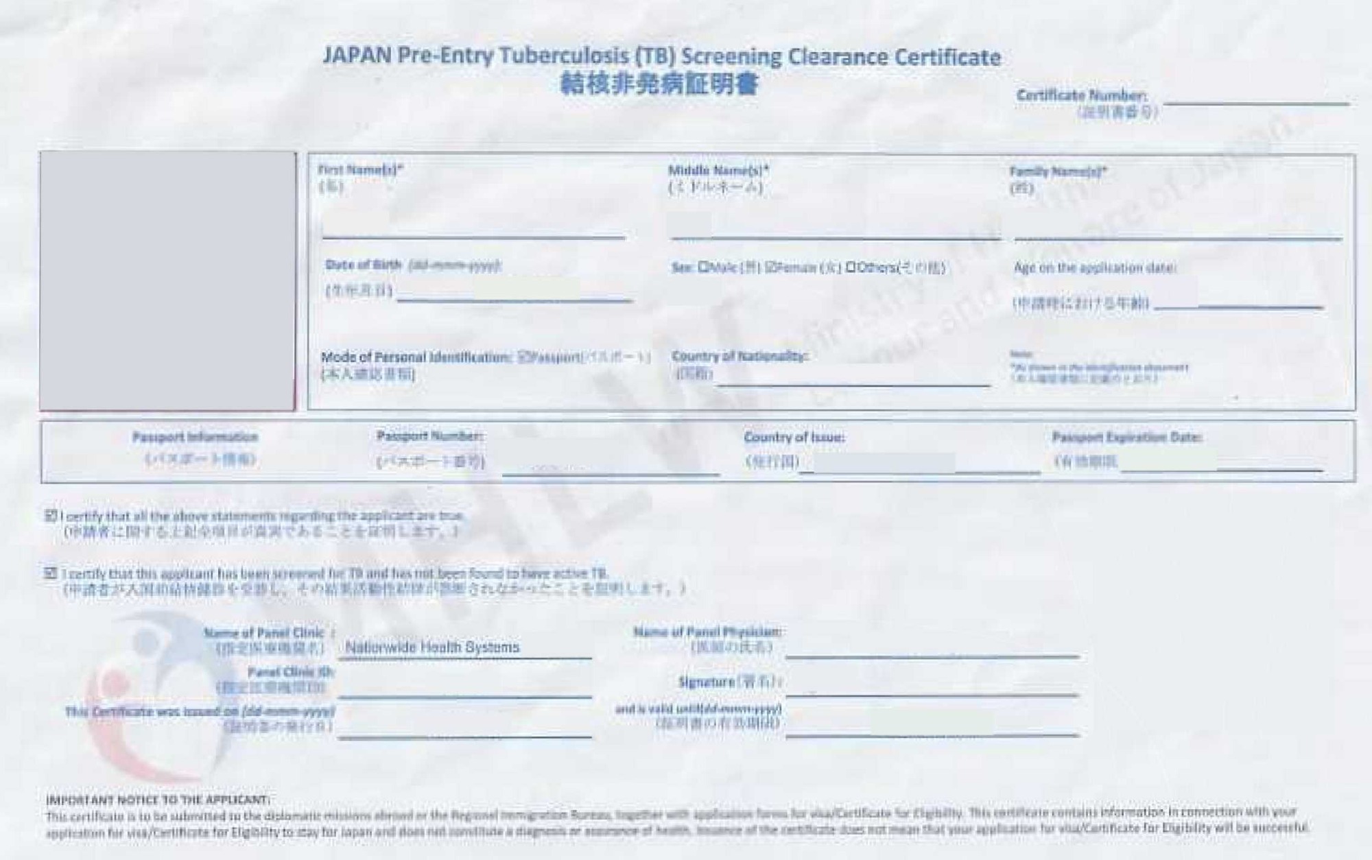 2025年6月23日から日本政府、JICAなど公的機関による招へいを除きフィリピン人の在留資格認定証申請には、フィリピン日本大使館指定検査機関(https://nhsgroup.ph/)での結核検査が必要となっております。認定証申請前に結核検査を受け非発病証明書を取得する必要があります。検査には、事前予約と検査費用として、7455ペソから8755ペソほどかかりますので、ご注意下さい。
